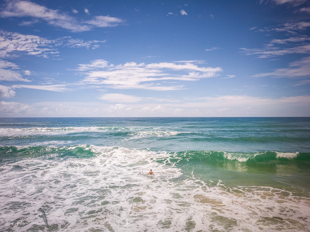 We have discovered a nice spot along the mainland side of South Stradbroke Island: The Dux Anchorage. Although busy on weekends, during the week it is quiet and very protected. We have spent over a week there, keeping ourselves physically active: daily walks through the bush and along the ocean beach, body surfing in the warm sea, fun playing with the drone… all good practice for what will come later when we head off. Here are a few aerial shots of our surroundings: