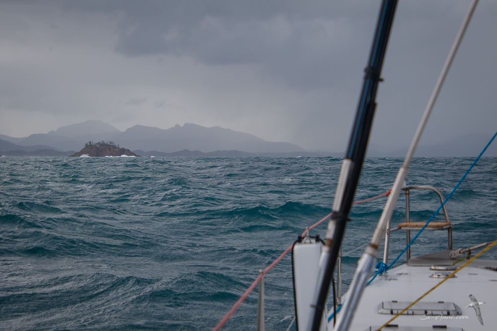 We had reasonably strong and at times squally conditions, not only because of the weather, but also because of the stretch of coast we were sailing through: deep bays and inlets, large 7m tides creating strong currents and steep waves. We have often found that the Keppels to Mackay passage is a bit like a Bass Strait crossing: confused rough seas making the boat pitch and roll.