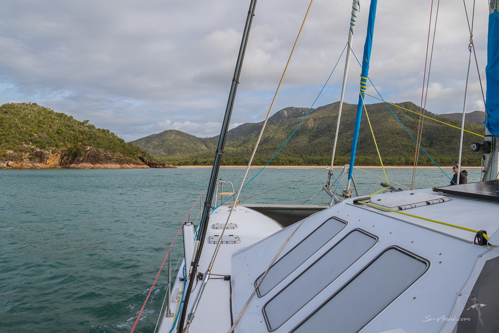 • The waves on that day were big. Some we surfed for a short time, some would just roll under our hulls, lift us up, overtake us, and break past us, like the one in the first photo. It was spectacular but not scary. It is funny you thought Anui was small because we thought that too! At Mackay they put us at the end of an arm reserved for large multihull, larger than us. We are 52ft, but are moored next to a 57ft trimaran called “Earthling” that would be insanely fast and a 59ft Outremer catamaran which would also be a speed demon. We thought we had a tall mast, but theirs are even higher. So yes we look diminutive next to them! Thanks for the good wishes. We feel helpless and dejected.