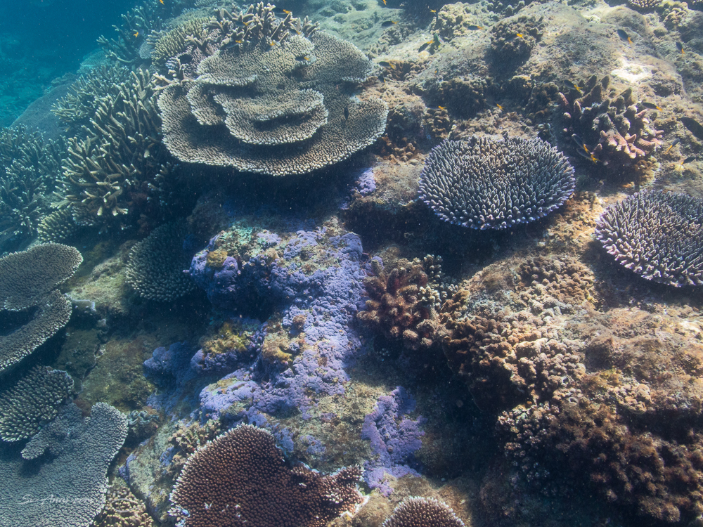 We were blessed with good visibility despite less than ideal conditions in 20+ knots of wind and strong gusts that made the boat swing widely. We guess that the deeper water – we snorkeled down to 8 meters at low tide rather than just below the surface – has saved this reef from the terrible coral bleaching that has affected the Keppels and some of the offshore reefs. The distance from the mainland is another saving grace since Barren is the most easterly island of the Keppels. This time at Barren Island renewed our hope for reef resilience.