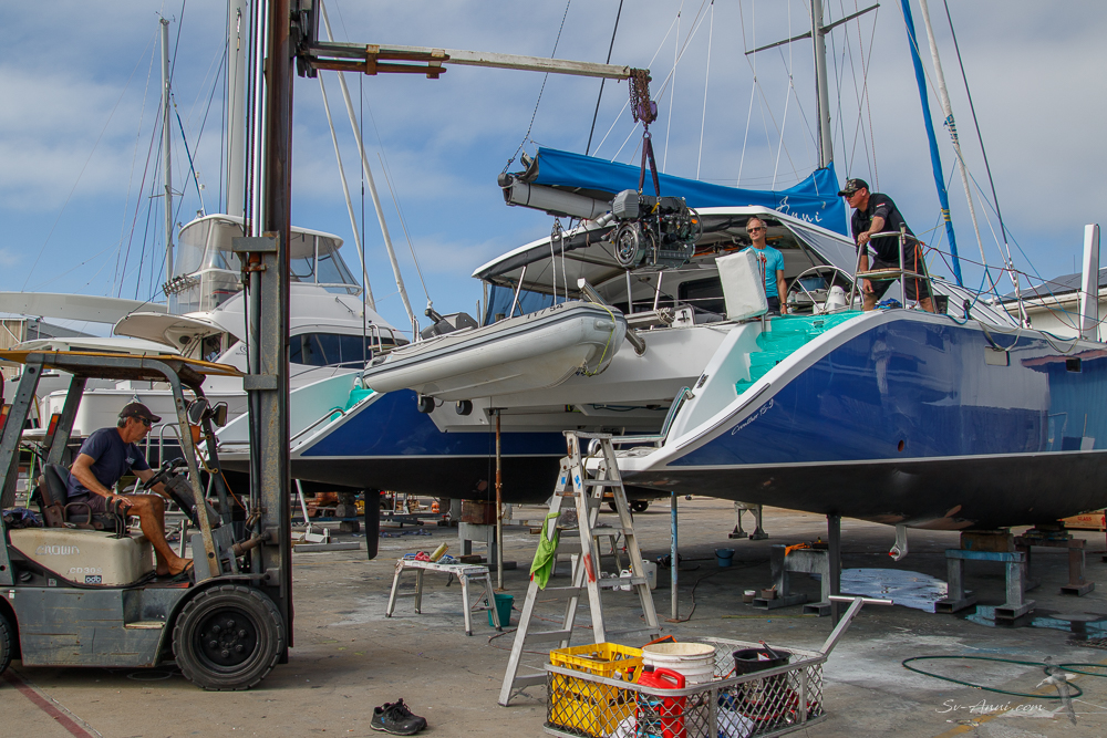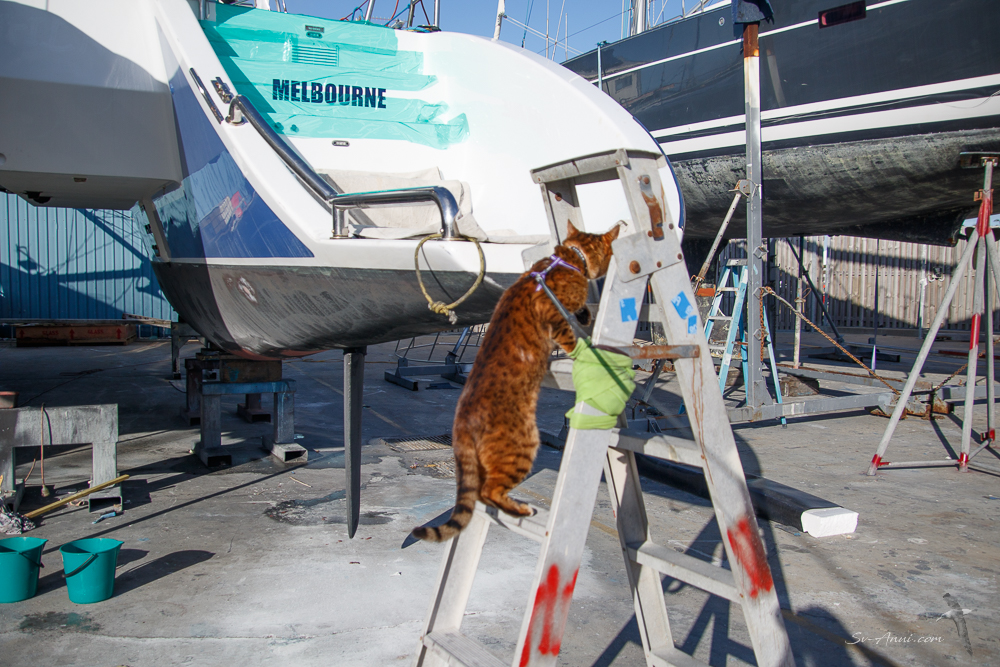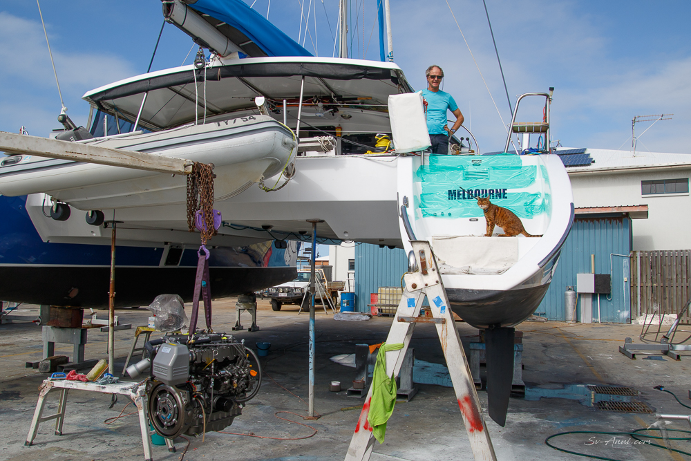 Most days while we are beavering away or just hanging around, Bengie plays escape artist. She takes off down the ladder morning and night, disappearing if you don’t keep an eye on her. Fortunately we now know her favourite hidey spots with sprigs of grass and patches of sand, so we can find her and bring her back home! And the shipyard workers have brought her back to Anui a few times too! She is a bit of a hit with them. And of course she checks out what is going on, like the engine getting lifted in!