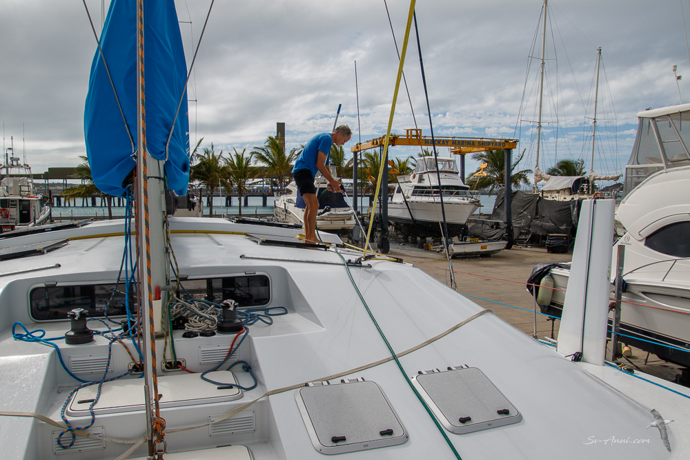 Jim from Mackay Marine Services is tackling the long awaited installation and the major job of reconnecting all the systems. Gauges, filters, fuel lines, exhaust pipes, water intakes, engine control cables, batteries, hot water system, water maker, alternator, new cockpit display panels, all have to go back in. The reconnection exercise is taking several days. From where we sit very slow progress is made each day. It is not helped by the fact the brackets made for the alternator and water maker did not fit! The fabricator had to be brought back in to fix this. Then the wrong bolts for the props were supplied, so we had to get the correct ones. And in the midst of waiting, emergencies happen on other boats and Anui falls down the priority list which annoys the hell out of us!