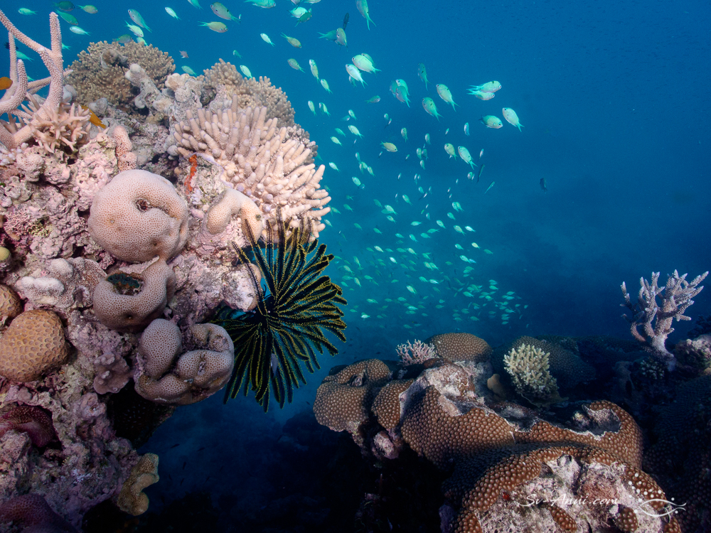Stanley Reef is in a Green Zone, so no fishing is allowed. It is deep, there is quite a lot of current running everywhere, and the coral was not in great condition, but we had fun. The best snorkeling was near the entrance to the reef and we also checked out a few bommies near our anchorage. We saw a lot of big fish: the largest coral trout we have ever seen (1.3m), big cods, ugly big bumphead parrotfish with a mouth like a horse, beautiful and colourful steephead parrotfish, batfish, the odd shark… The nicest feature of the reef walls along the drop offs was the many elegant crinoids, those feather stars that come in shades of black, red, green and orange and filter the water for nutrients. And there were lots of tiny bait fish too. You swim among them and think “it’s raining fish”!