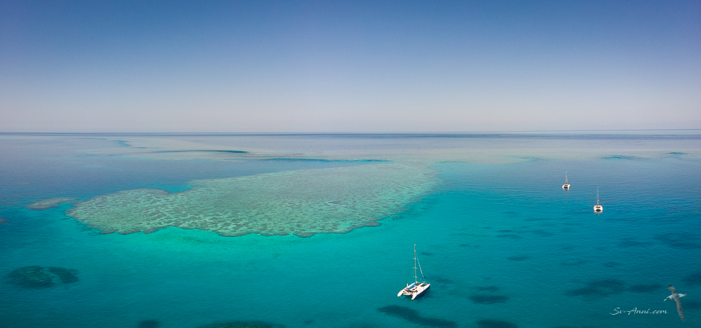 This was very much the case at Stanley Reef. This reef has an oval shape with inky depths on the western side of an even deeper central channel running along a semi continuous wall with a maze of gutters on the eastern side. The channel gives access to a shallower sandy area near the southern wall. We followed each other inside, Anui leading the way, dodged a few bommies as we got further in and bingo, the three boats anchored in a lovely big patch of sand in 8 to 10 meters of water, just where we had hoped!