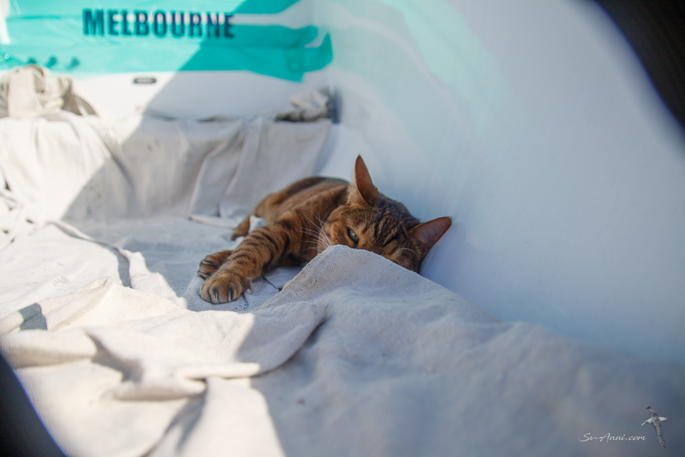 • Hi Penny, Bengie is very comfortable and used to living on board so has never suffered from anxiety. She is a pretty relaxed bengal. Always upsetting when a pet is not well. Has your daughter been able to identify what stresses Tommy? May be she should talk to a vet if not already done. Will pop over to say hello when we get back from the beach later this afternoon.