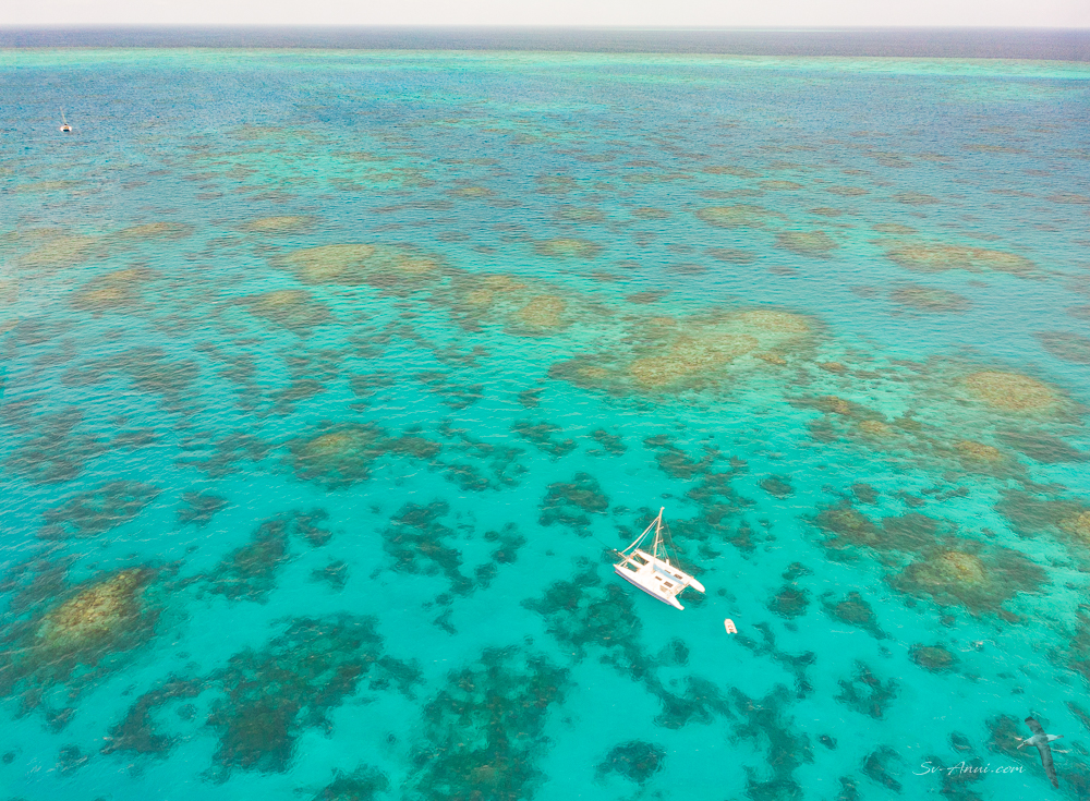 We got to Lodestone Reef in sunny weather with a 10 to 15 knots breeze. We were so lucky to have this place to ourselves. There is a public mooring there which we took, but there is plenty of clear sand to anchor in 8 to 10 meters of water, so no stress!