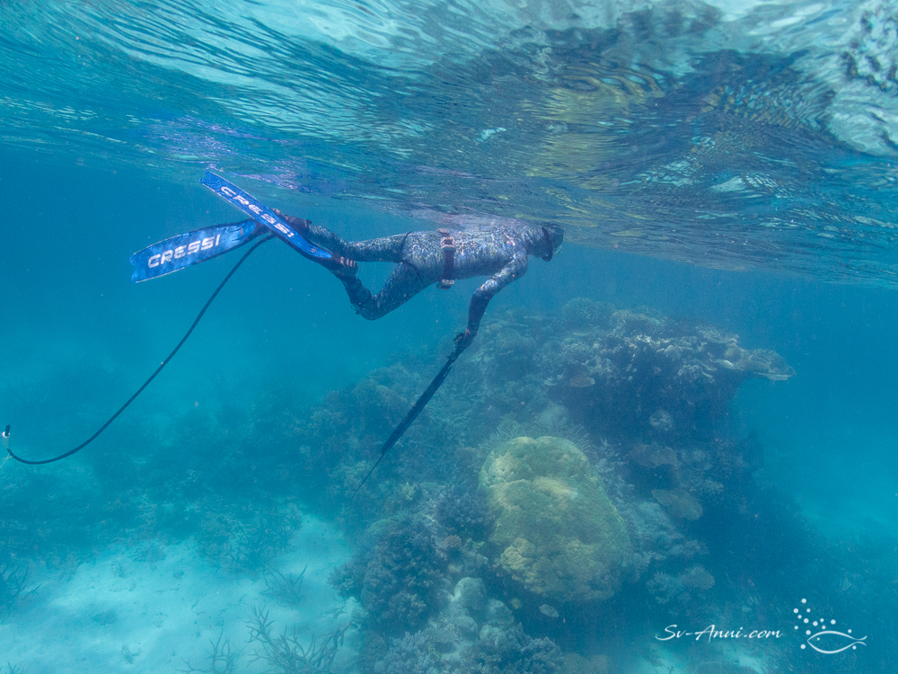 We snorkeled along the edge, at one end of the reef and off a large isolated bommie which was the best of the locations. The water was crystal clear, coral variety and density was good and the highlight for us were the swim throughs, 8 to 10 meter deep little gorges lined with beautiful gorgonian fans. Good freediving practice but it uses a lot of energy!