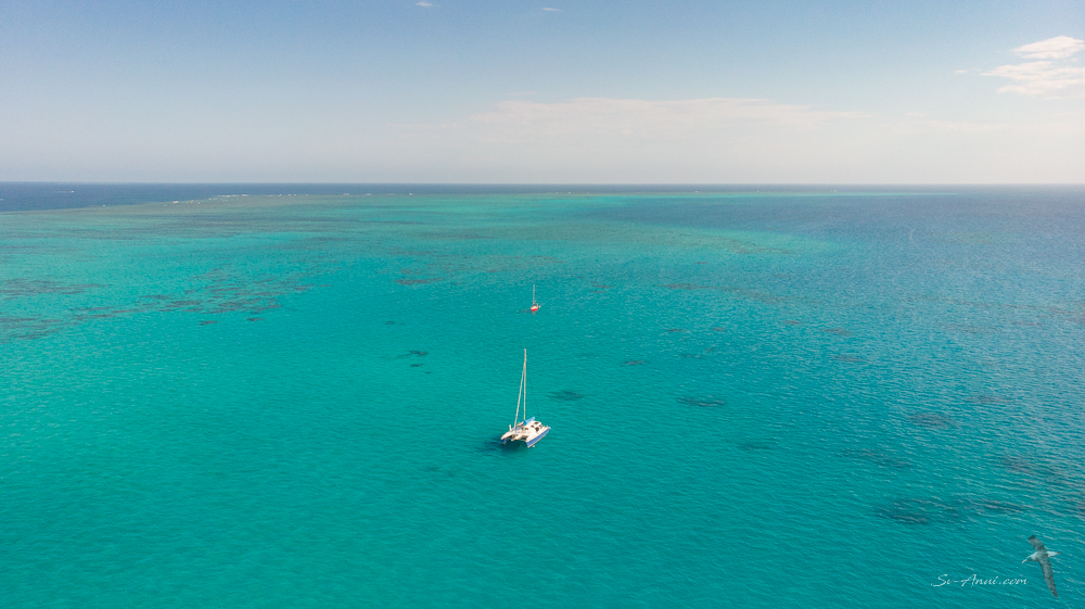 Coming into the northern end of St Crispin is an education in evaluating the depth of the bommies. “This looks dark, must be deep enough to go over… This one looks aqua and tan, better dodge it!” We were very much alert: satellite chart on display, Wade at the wheel, Chris on the cabin roof, both of us with the headphones on to help find our way through the coral outcrops. Our original intention was to anchor at the very top, but with too much current flowing, we opted to search for a calmer alternative further south along the reef. With a bright day and the sun high in the sky, the visibility was excellent and after some searching we hit the jackpot: a very large sandy area in 4m of water at dead low tide… perfect arrival time. As is our habit, we flew the drone to check out our surroundings from the air. You can see the extent of clear sand we anchored in. Two other yachts were in the shallows and a research vessel was anchored further out.