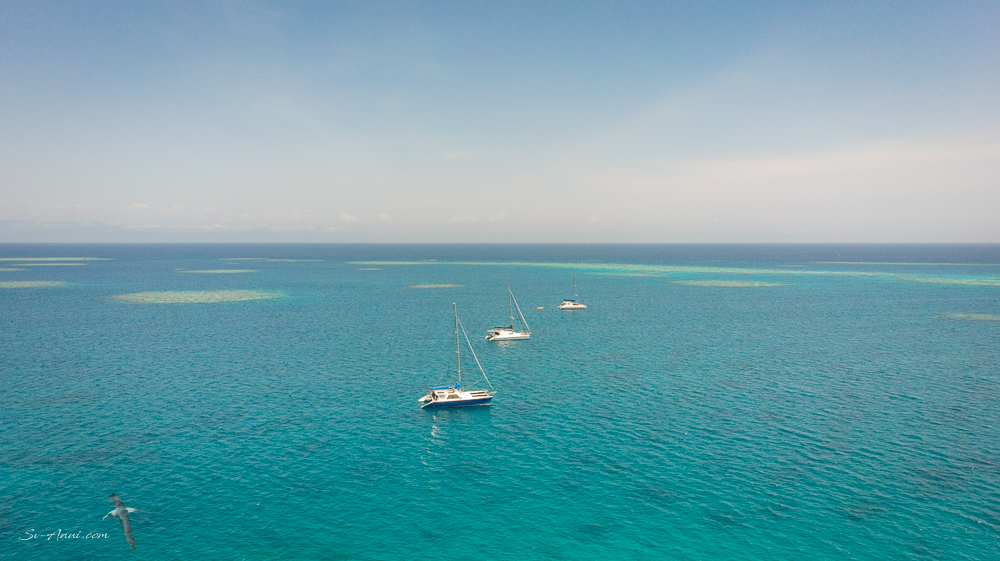 Let’s start with the aerial shots. We flew the drone on the first day in 15+knots and did not dare go too far. But the next day, it was all calm and Chris could see in her mind’s eye the panoramic image she wanted: the glaring of cats in the foreground, the shape of the reef and lagoon clearly visible beyond. So from the hot deck in hardly any breeze she sent the beast further and higher than ever before to capture both the Agincourt triangular reef and the three cats together for the last time in a while.
