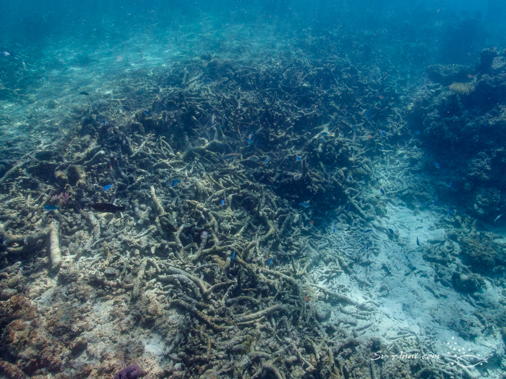 Bleached corals are weaker and more susceptible to a microbial takeover fuelled by algae. Once fleshy algae gain foothold in a reef, it encourages the growth of disease-causing micro-organisms that can kill coral. It is not uncommon for lagoons to heat up too much in summer and consequently we are seeing less and less live corals inside these shallow inlets on the inner reefs.