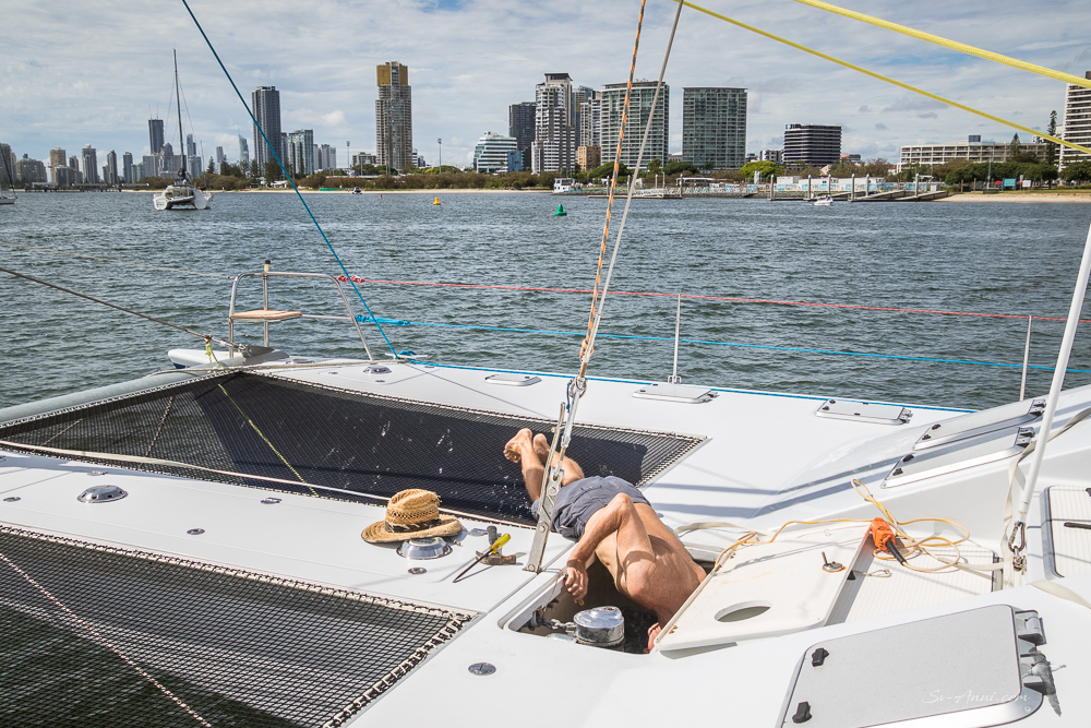 Unable to leave on Christmas Day as hoped without a working anchor winch, we waited till Boxing Day, knowing we had to attack the anchor well with a cutting tool to improve access. Luckily our friends on Oceaneer are also on the Gold Coast and gave us a hand. Wade and Tam cut an access hole in the back wall of the anchor well, allowing enough room for the motor to slip out. The pin was changed and the hole was then resealed.
