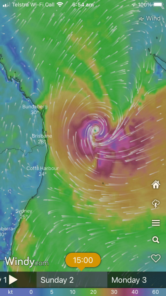Of course by then we missed the small weather window to leave Queensland and instead were faced with a week of nasty stormy conditions. A SE front moving north and a monsoon trough coming south are merging, creating strong winds, heavy rain and big seas. This is not the time to venture out and head along the NSW coast where the only sheltered anchorages are up barred rivers!