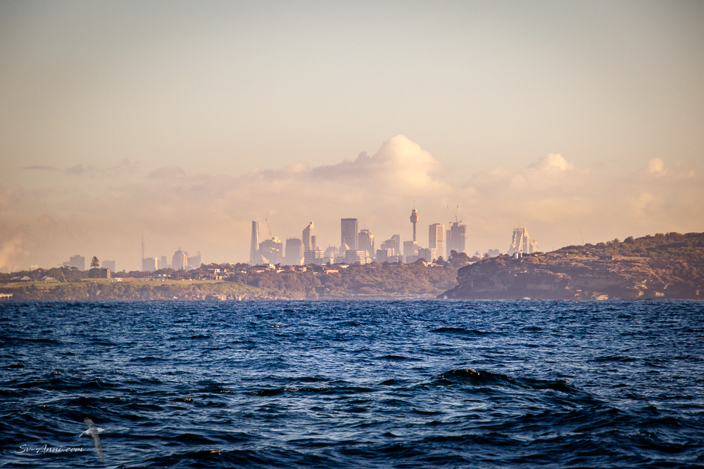The coast on either side of the Sydney Harbour entrance is scenic, with tall cliffs and glimpses of the city skyline here and there.
