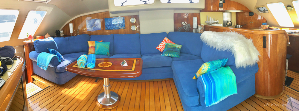 There is a small handful of people we are happy to welcome on board with an open-ended timeframe and Greg & Ann are two of these. Anui makes it reasonably comfortable. With guests enjoying their own bedroom and bathroom separate from our own hull, there is some privacy. The cockpit is large and serves as our dining room at anchor. The saloon is broad and pleasant. And with a water-maker that produces 160 litres of water an hour, we don’t have to be quite as stingy with water consumption as we used to be on our previous boat.