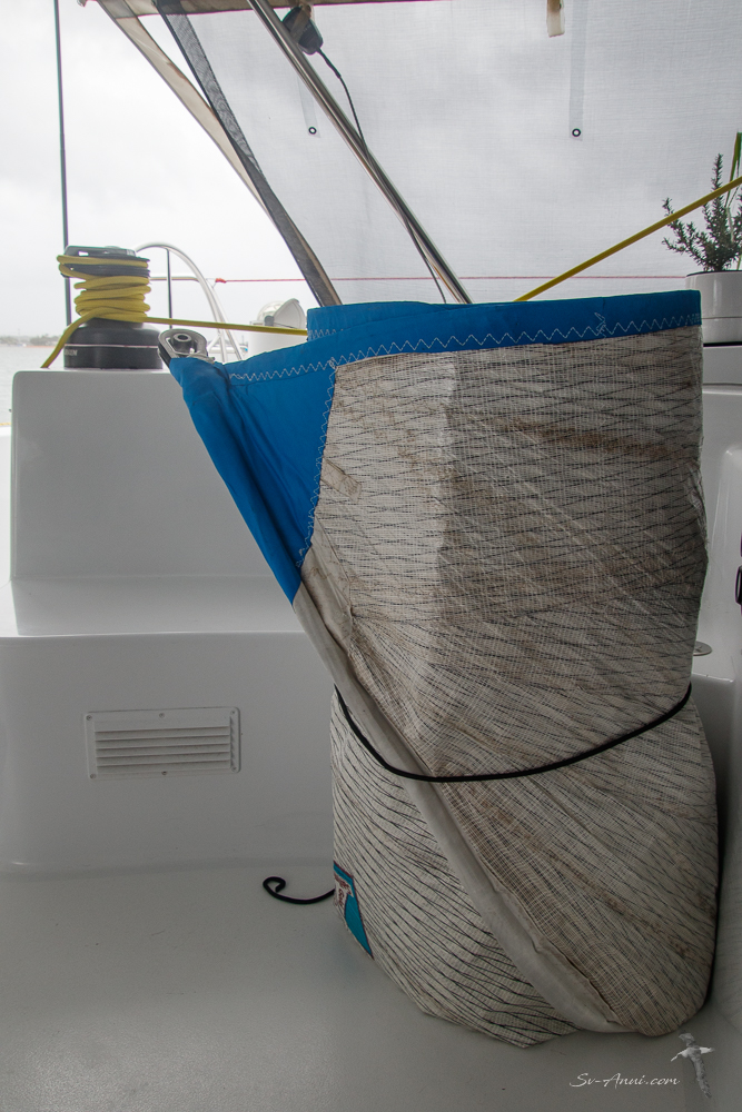 We got our screecher sail back from the sailmaker. It sat rolled up in the cockpit for a few days as it was way too wet and windy to set the sail up on the new furler. But eventually it went back up, which was a bit of a “where the hell does that go?” session out on deck. It got a little precarious on the prodder pole too!