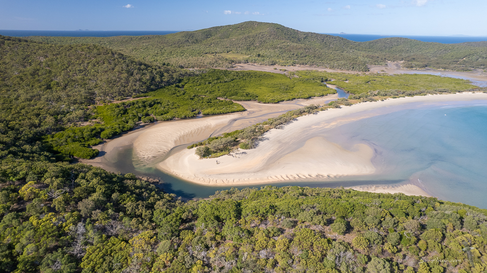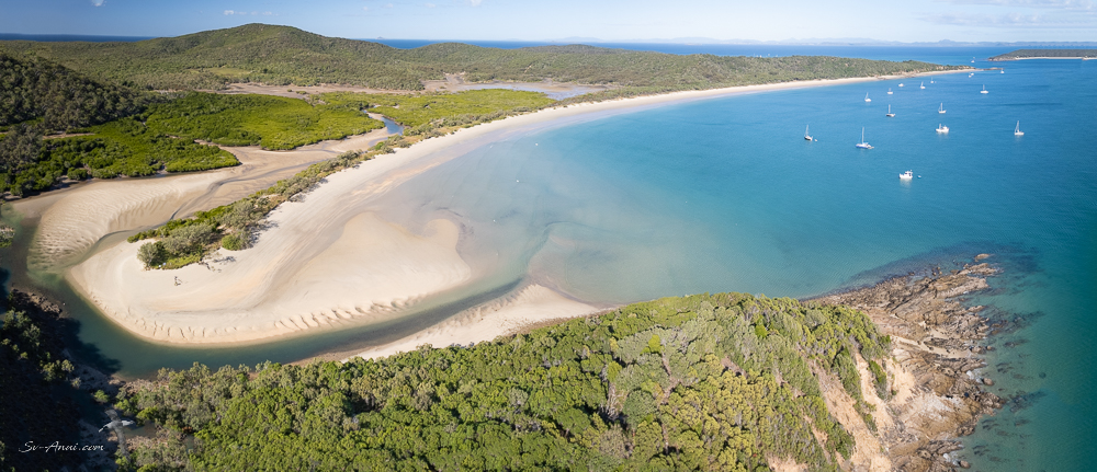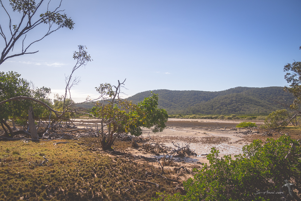 We did the compulsory two hour bush walk from the anchorage: along the beach, following the dried up lagoon to the Homestead at the end of the mud flats, then up the hill to the lookout and back, just enough to stretch our legs and deserve an afternoon nap back on board afterwards! You can just about see our path on the panoramic aerial shot above.