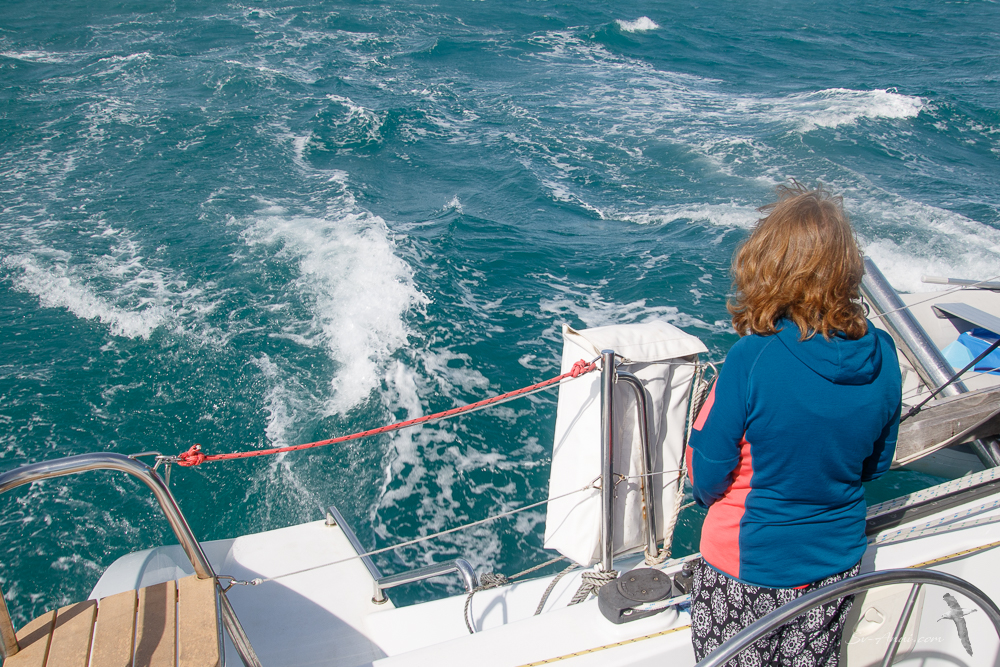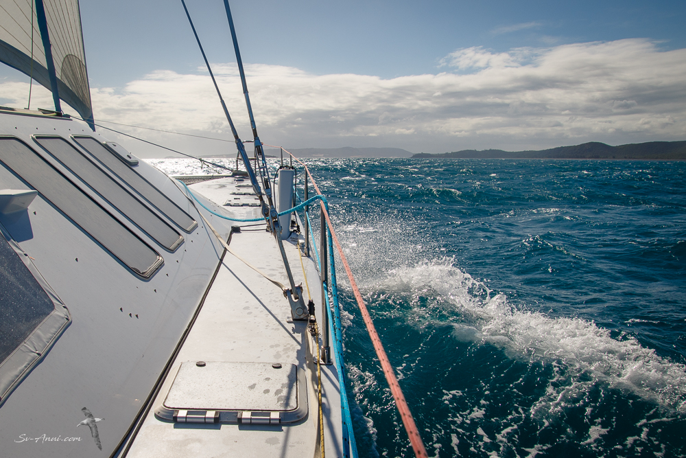 We had a fast screecher sail from Pearl Bay to the Percies. It is often a lively stretch of water with big 7-8 meter tides and lots of current. With 20 knots of breeze, some swell and a following sea with lots of white caps Greg and Ann got to experience a more rowdy sail. Top speed 16 knots… not quite our speed record but still fun!