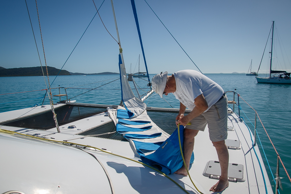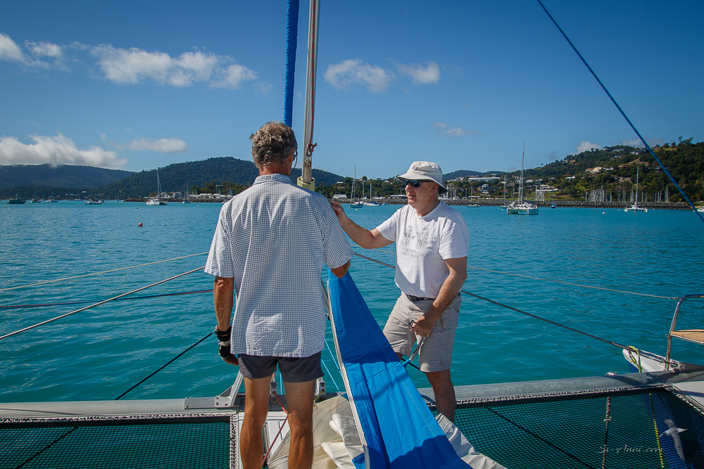 A few minutes later we blew the webbing on the clew of the jib and had to turn back to Airlie for a sail repair! We got some great service at Ullman Sails the very next morning!