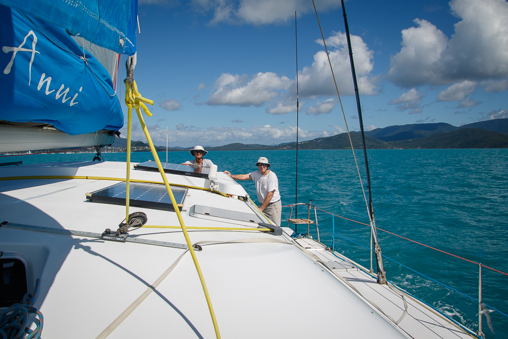 It was a tad windy: two reefs in the main hard into wind, we were going great guns showing Bill the power of Anui… 10 knots speed, flying and looking good to the point where another cat going the other way posted this on Facebook! « Sorry Anui, this pic does not do you justice. Just before taking the photo you powered up looking great ». Always special to get a photo of her under sail!