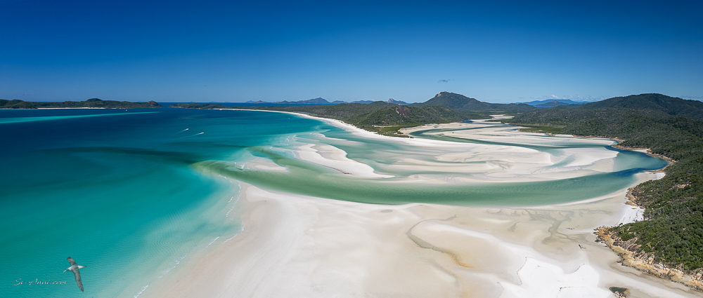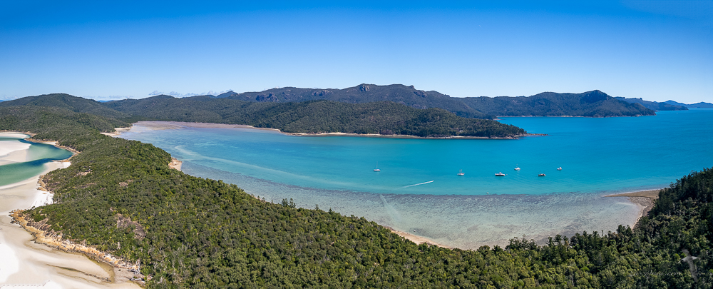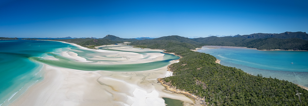 At near low tide, we walked up to the Hill Inlet lookout. We were lucky to have the place to ourselves in glorious sunshine, a great opportunity for some panoramic shots with the Canon camera, just in case it was too windy to launch the drone from the beach. But it was not! So Chris flew the beast briefly to get the shots she missed last time. Once you have done a reconnaissance flight, and understand the lay of the land, you are better able to compose the panoramic image you have in your mind’s eye: the arc of the Whitehaven Beach, the full view of the entrance to the inlet, meanders of the stream and the sight of adjacent Tongue Bay, with Anui in the picture. Those colours may seem unreal, but that is how it really looks! It is the most breathtaking spot in the Whitsundays. You can see why it lures us to return time and time again.