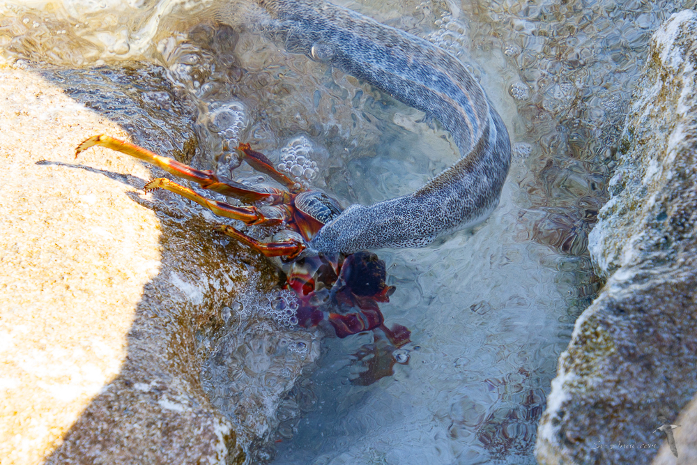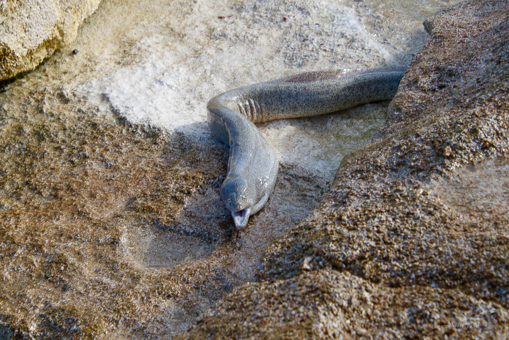 We did see some moray eels in the rockpools behind the island, a first for us. They were Grey Morays hunting for rock crabs. We saw a moray attack a poor crab which lost three legs and the corner of his head after it got targetted twice! We were very careful on the edge of the rock pools as the eels were aggressive, hissing and launching at us!
