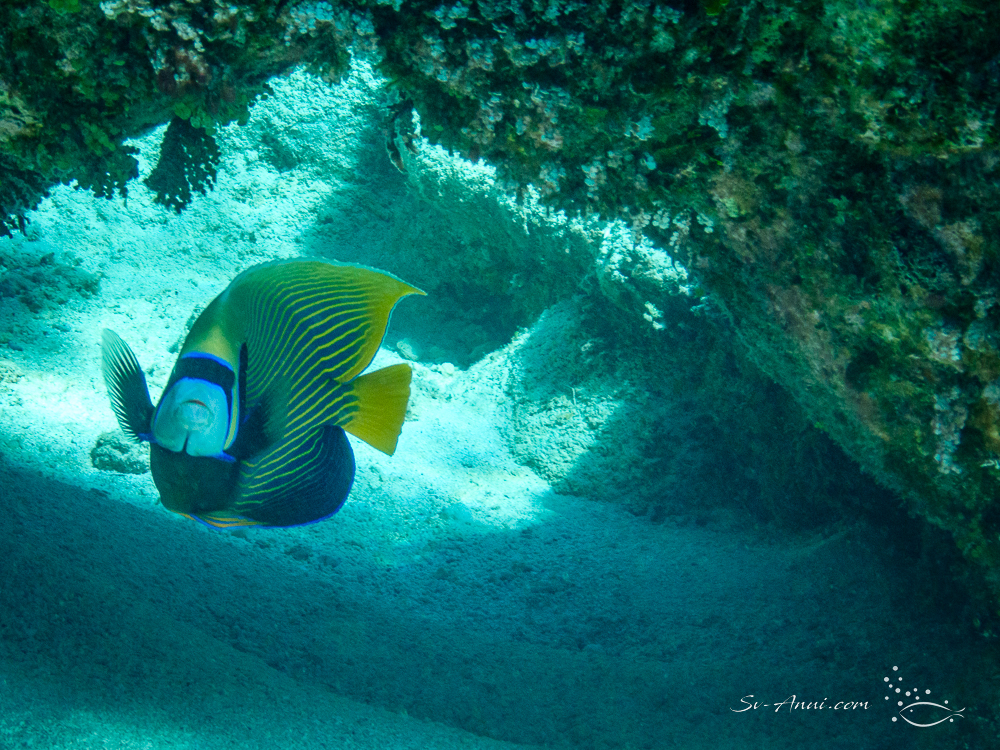 We eventually tried snorkeling, not hoping for much. The reef was just bare rock with hardly any coral cover: a waste land underwater. Although there were a few larger fish (we were in a green conservation zone), it was again like a desert and the current was strong. Apparently large storms assail the region in cyclone season and the reefs close in are all but destroyed. We only have one critter to show for one short dive, this magnificent Emperor Angelfish.