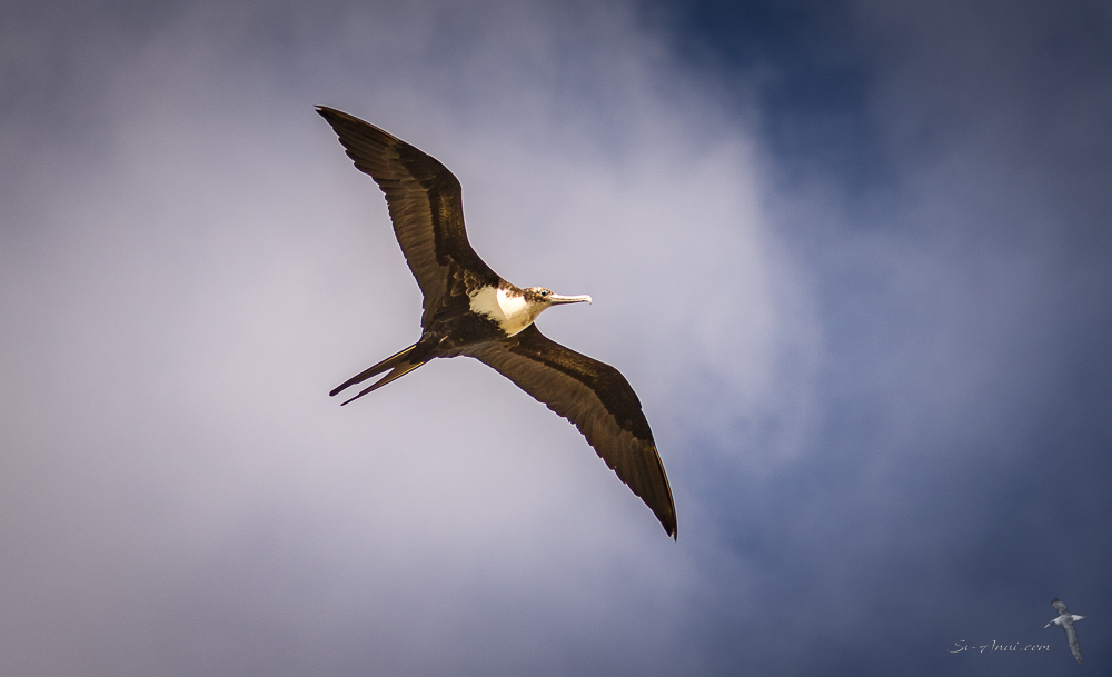 If tropicbirds were the nice guys, the thugs were the frigatebirds. Those large seabirds are known from one thing: stealing food from other birds, especially boobies. Do you know why? They can’t touch the surface of the water or they get water logged and drown. They do scoop water to drink with their beak and catch flying fish. But variation in their diet comes courtesy of the experts at plunge diving for fish: the boobies. Any type of booby is fair game for them: brown, masked, red-footed boobies will do. The frigatebirds circle above the boobies as they dive for squid and other tasty fish, and as the fishers take-off with their catch, the frigatebirds pounce on them and harass them until they drop their bundle or regurgitate it! Nasty stuff, especially when the squid vomit, as Wade called it, lands on our deck in a purple mess!