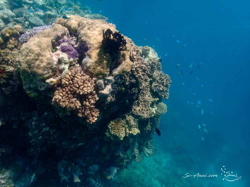 After our positive experience around isolated bommies at Opal and Lena Reefs, we have been favouring these rather than the inside edge of the Ribbon Reefs for our snorkels. There is generally more life along the sides of the pinnacles than along the leeside of the reef platform. However at Ribbon No5, there was not a lot to write home about. We found the large bommies quite damaged by successive bleachings, some with algae over dead coral, generally looking drab and sad.