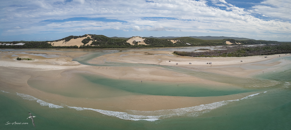 Firstly, we had to get to the top of Moreton Island. From Tangalooma, we headed to Yellow Patch at the Northern end of the island and dropped the pick in front of the group of tall colourful dunes. This is a scenic anchorage normally frequented by fishing boats rather than yachts and cruisers, great for beach walks, sometimes good for surfing on the point, and although the ocean is rarely totally flat up there, we were comfortable enough. We often use this anchorage when sailing north from the Gold Coast on the ocean side rather than the Moreton Bay side. This is what it looks like from the air. There is a kind of shallow lagoon which makes it interesting and attracts many birds.