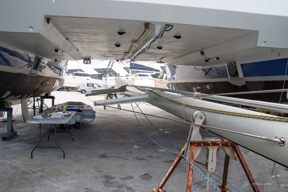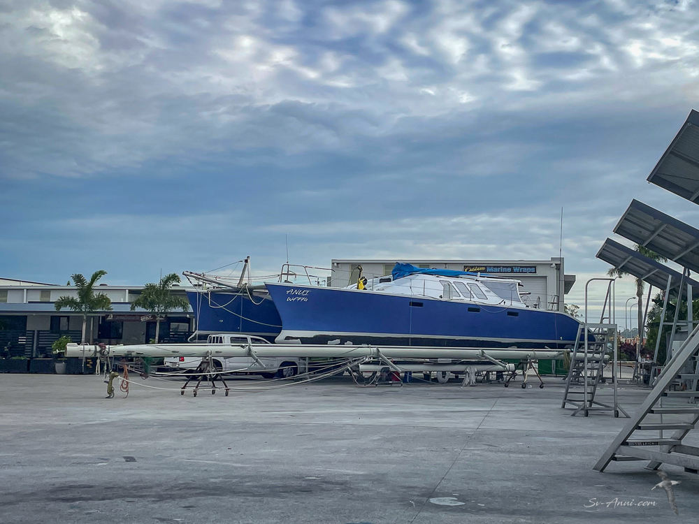 Craning the mast back up and rigging the boat of course could not be done until a solid mast step is reconstructed. So Anui is still looking like a crab without its gear up.