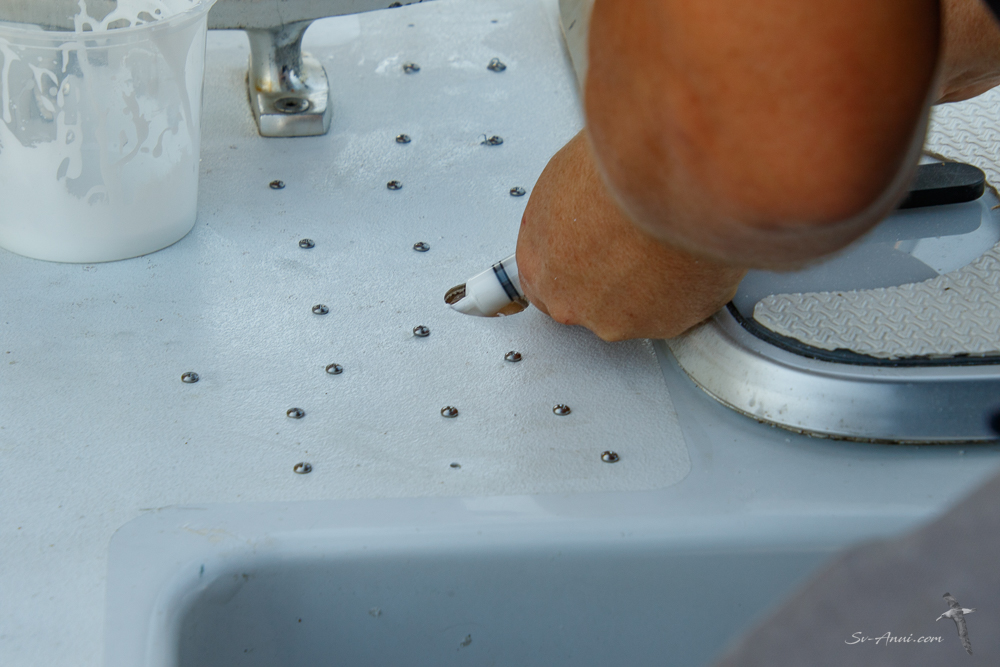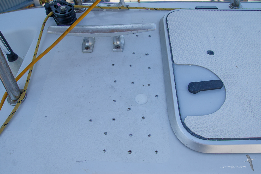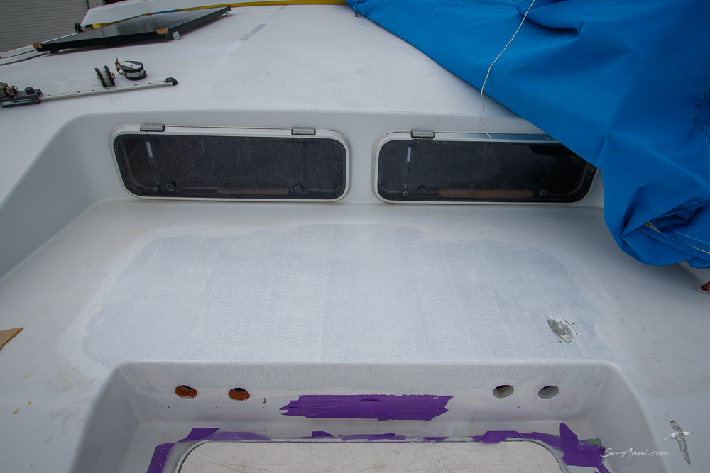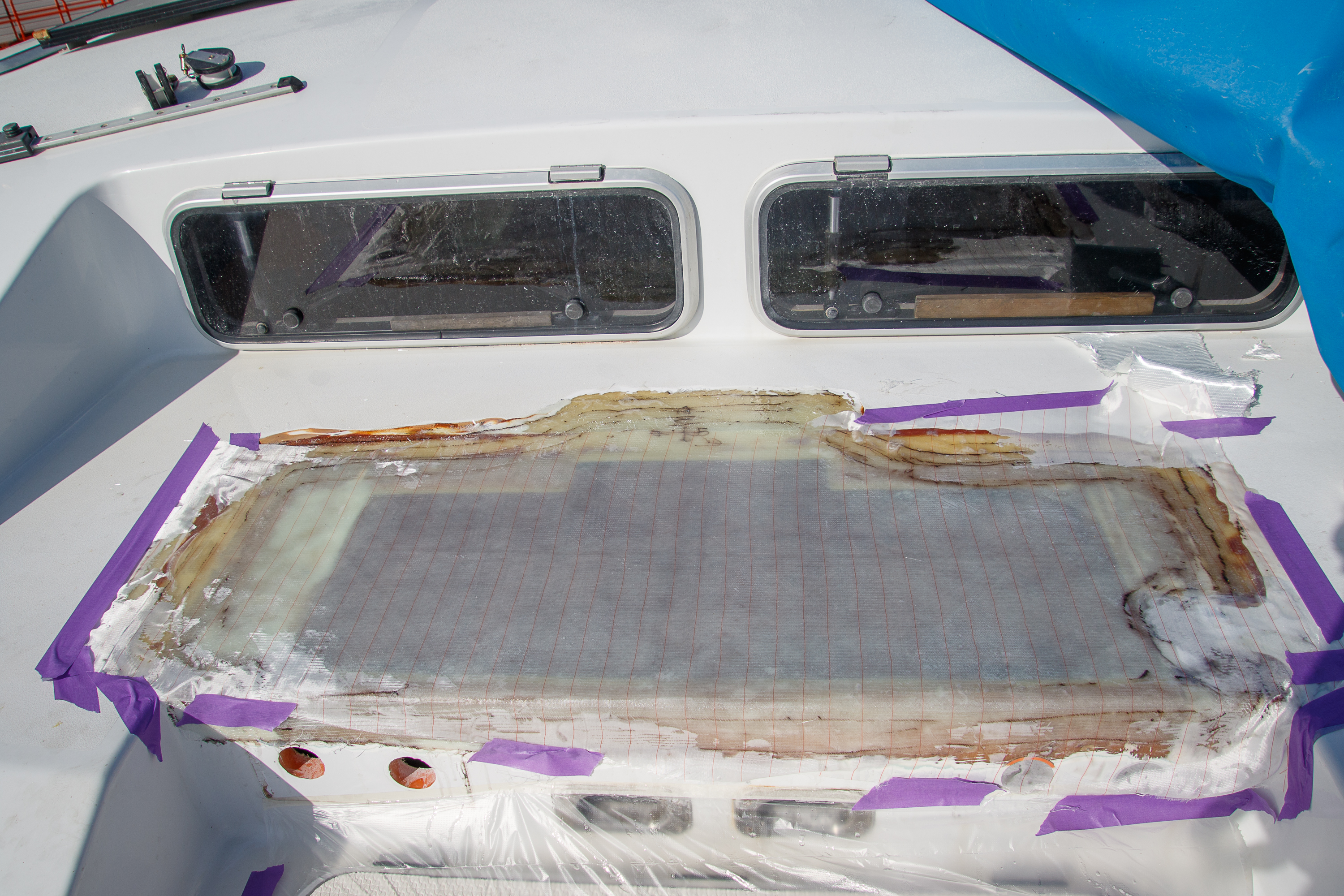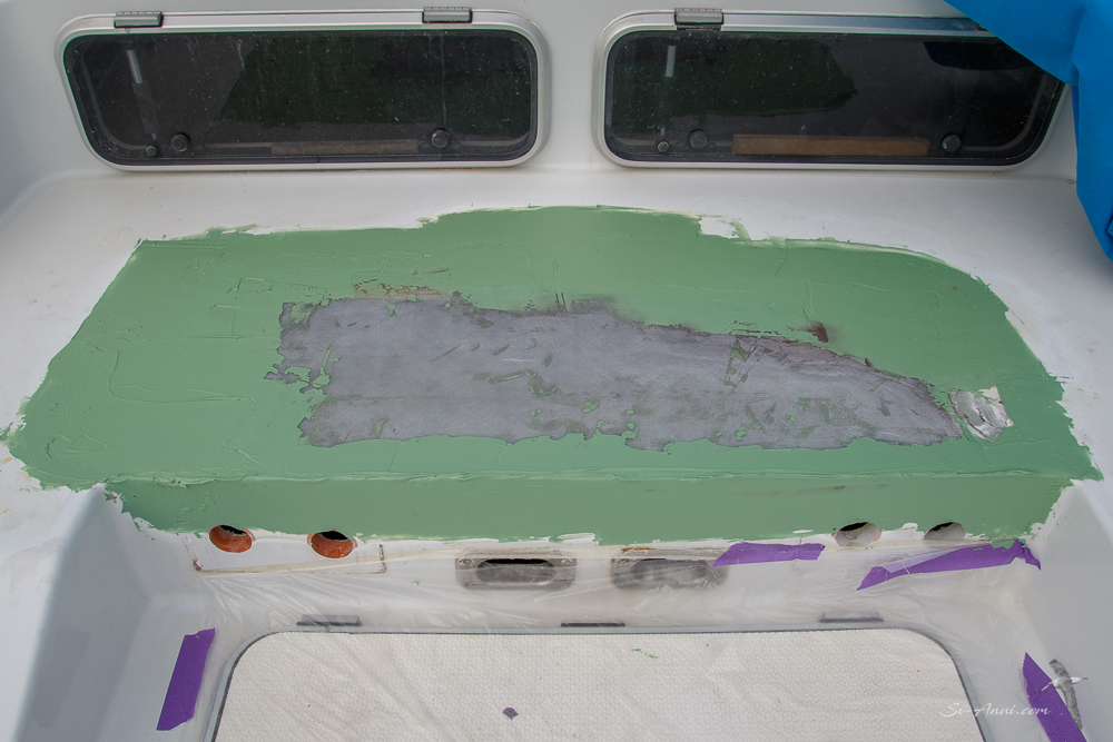 This is probably the least invasive repair for this haulout! Ryan drilled an inspection hole where the deck was delaminating at the back of the port engine hatch. We were all glad when it showed everything was dry and healthy under there; the top layers of fibreglass just needed to be glued back to the foam layer. Ryan proceeded to drilling small holes, injecting resin and fastening the layers together with screws! Once dry, the screws were removed, the area resealed, sanded and primed. Next it will be repainted.