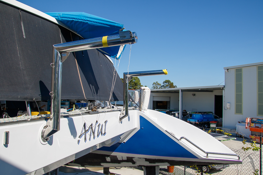 The first job to have been ticked off is the new davits. Shine Stainless Steel Fabrications used the mount of the old ones, welded the taller right-angle tubes to that, to give us the height and clearance from the stern of Anui. We are happy with how it looks. The davits are sturdy, there is no scaffolding at the back so they are not objectionable nor blocking the view! The dinghy will be lifted in place when we are back in the water. For now it just sits under the bridge deck.