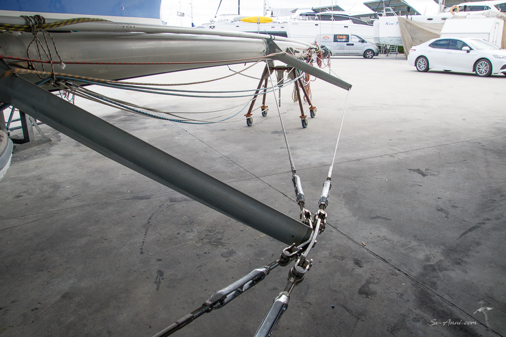 It is likely the standing rig will be back up next week. In the meantime though, SK Yacht Rigging have fitted the diamond stays and shrouds onto the mast and spreaders. Check out the shiny new turnbuckles! They look like jewels and are pricy like jewels! The guys have done as much as they can while the mast and boom are down; they have improved the way the spinnaker halyard is fed out of the mast and made a few other changes to the fittings. The various stays (forestay, backstay, cap shrouds, etc…) which prevent any backward, forward or lateral movement of the mast when it is up are ready to go, so it will be quick once the mast step is operational.