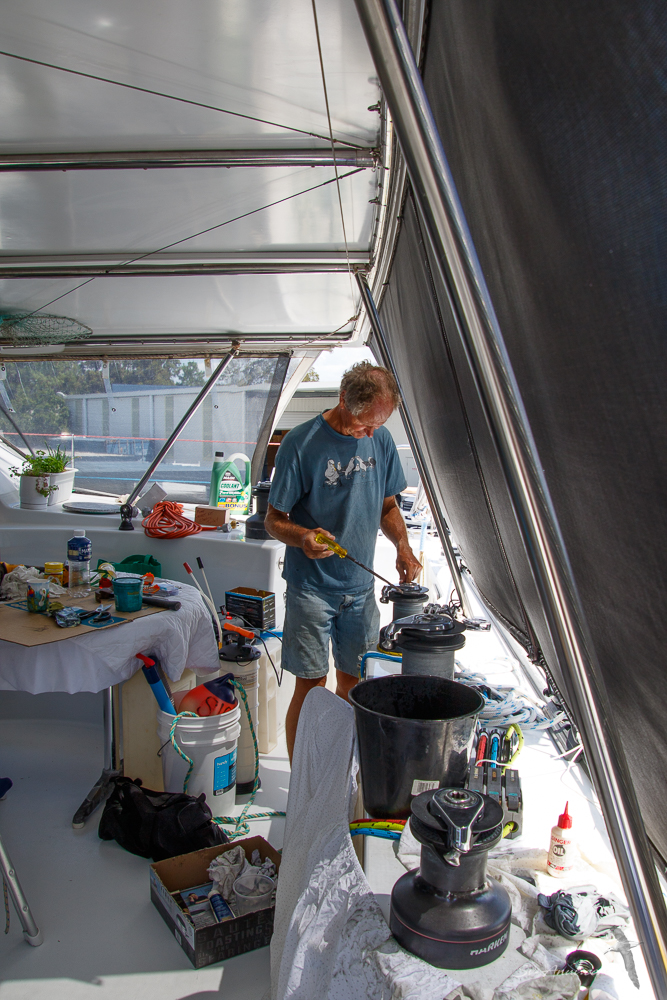 As always we have handled a few jobs ourselves: the hulls have been scrubbed in preparation for the antifoul, the dinghy is cleaned up of all the algae and tea stain and looking much more presentable (citric acid and elbow grease do wonders), we have threaded the dinghy lifting lines for the davits as well as the wires for the stern light and AIS aerial. The BBQ is scrubbed and de-rusted, the marine toilets and seven winches serviced, the anchor chain swapped end to end, all the steel fittings on deck have been cleaned of rust with phosphoric acid. There has been more cleaning of upholstery to get rid of wood shavings, fibreglass dust and other itchy nastiness, and while it was not too hot the spare bed quilt got repaired. Chris even planted some new herbs to replace our dead ones. We have been busy, everything takes ages, it is hard yakka in the heat and our backs are complaining bitterly!