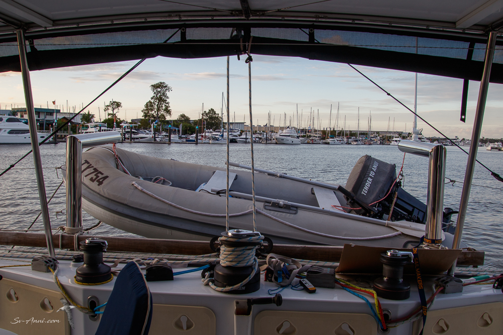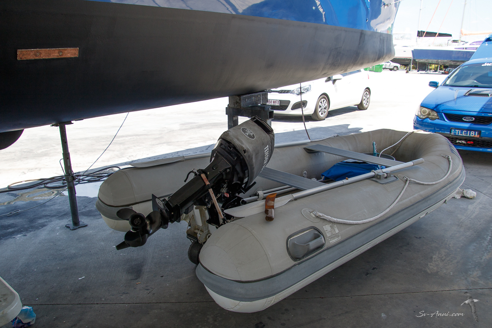 Once afloat we were able to hang the dinghy from the new davits and adjust the length of the lines. Here is how it looks at the highest point, for when we go offshore.
