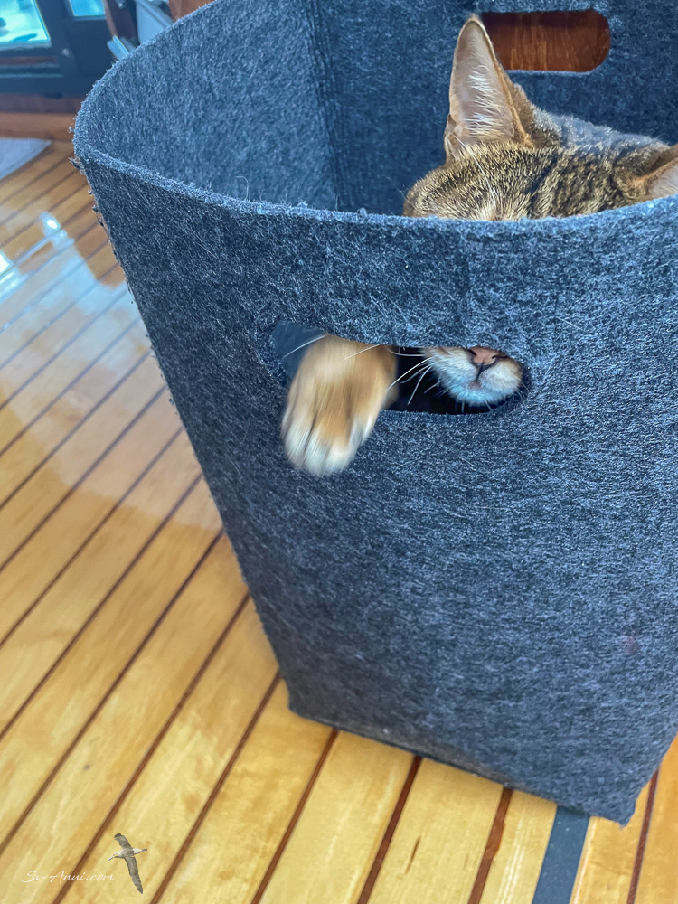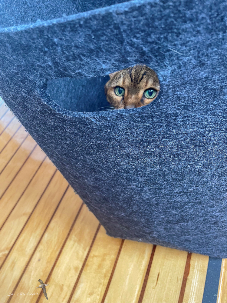 Meanwhile on the last day pussycat Bengie was torn between exploring the shipyard and hiding in the laundry bag… she loves bags! The bag won which is rather lucky because we did not want her to escape then come back home with grubby paws! She is so cheeky… keeps us smiling.