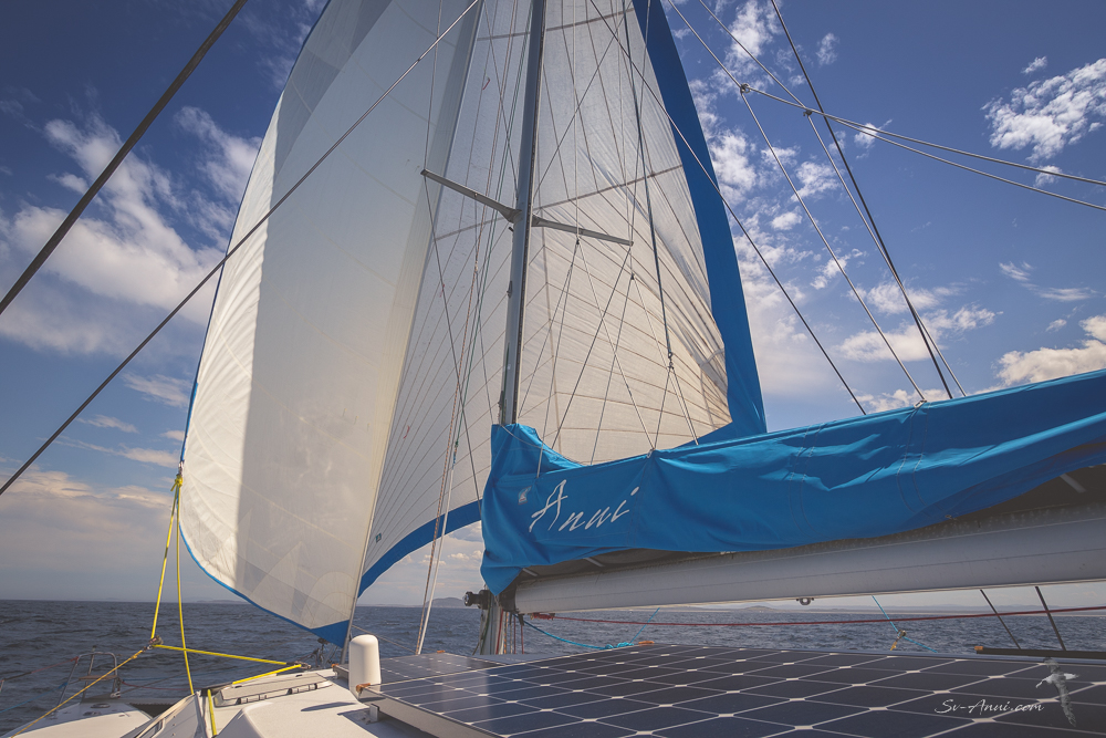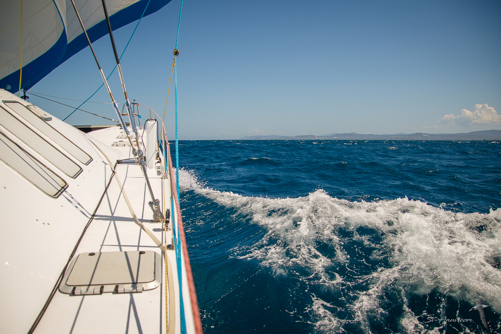 Our last hop was an easy 70nm with a strong northerly forecast but the 25+ knots did not eventuate. No early rise this time. The breeze was steady at the start, so the screecher was on duty as soon as we were out of the harbour, then it lightened, and we added the jib, goose winged. We were nervous about setting up the spinnaker instead with the strong wind warning. It was a comfortable downwind ride.