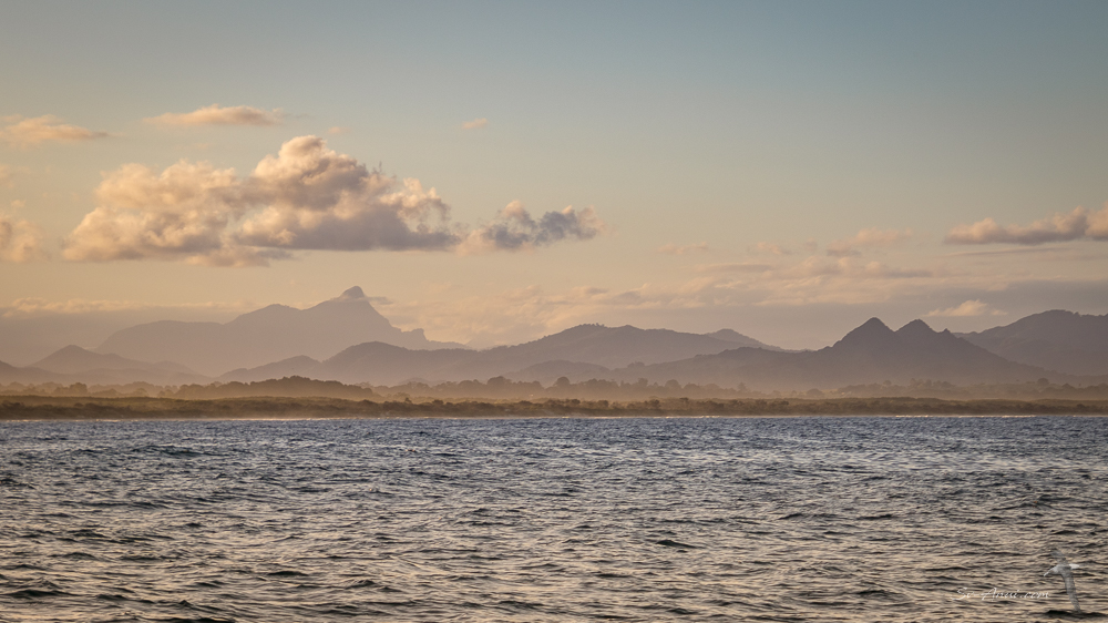 We often stop at Byron Bay on the way north or south. It is never all that comfortable, particularly when the bay is a lee shore, as it was this time, but Anui rides the swell well. It’s just a spot to break the journey and stop for the night then move on! No nice sunset to speak of, although the view towards Wollumbin (Mt Warning) was quite beautiful.