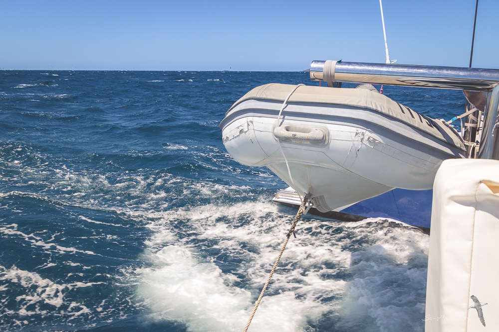 We had the dinghy set up high on the davits to test the ‘offshore’ position and it worked well. Despite the following sea and 21/2 meter swell, there was no slapping or splashing at all.