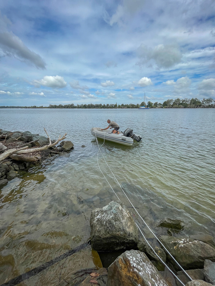 We love our dinghy and the power of its outboard, but it is heavy and beaching it is always a struggle with the tides. We have been researching ways of setting up a pulley anchoring system so the dinghy floats away from the shore, but nobody has to get wet bringing it into shore and retrieving it. Wade set up a few shackles, two anchors and a length of rope to do just that after studying YouTube videos. We tested the system while on the Hastings River. It is a bit of a fiddle to organise but it works well.