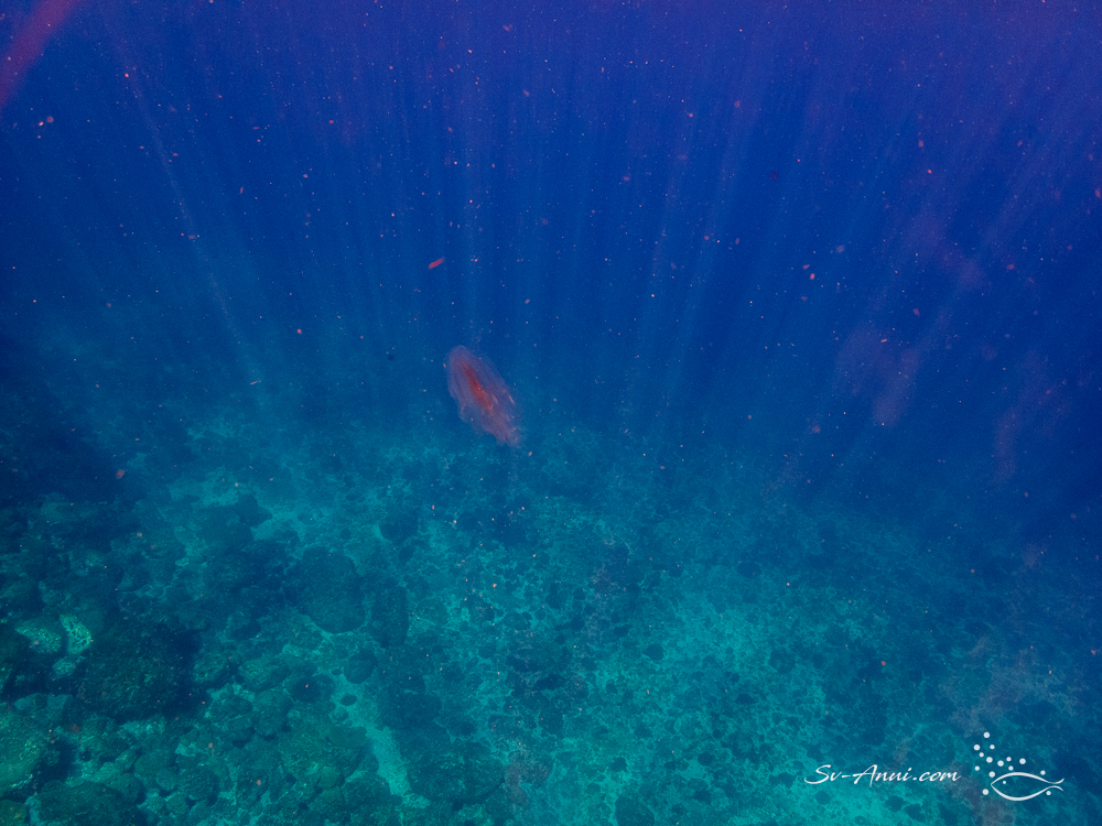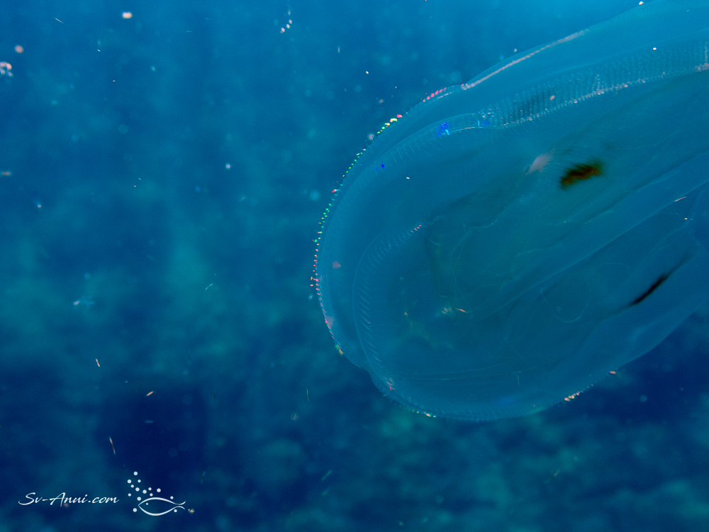 A surprise there was the quantity of Ctenophores, a type of comb jellyfish, drifting mid water. They are hard to photograph as the camera has trouble focusing on their clear gelatinous body as they move past. They varied in size from 5 to 10cm long. If you are wondering, these strange beasts do no sting. Instead of having harpoon-like stinging cells as in the cnidarians, comb jellies have sticky cells which act more like a rope covered in honey. They are not toxic. They are the type of critters to photograph at night when their combs are lit up and they look like space ships! We have included a photo from a few years ago taken from our previous boat so you can see what we mean.
