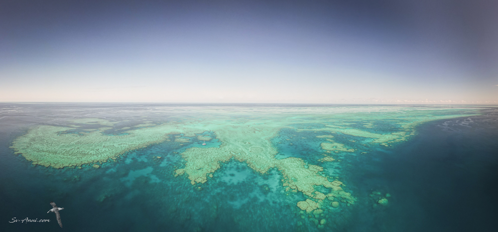 Big Stevens is a large reef with a nook on the NE side – a very tight spot, barely big enough for Anui, but oh so spectacular. We dropped the pick in 9m of water over clear sand at high tide. We broke our own rule of 5:1 anchoring ratio. We had just over 3:1 with a short bridle to ensure we had enough swing room. With a forecast of variable wind to 10 knots, which means the light breeze can come from any direction, we were fine. In the morning we woke up stern to the reef in front of us in the aerial below – glad we did not have another 15m of chain out. As we said: tight spot! Here is a series of drone shots progressively getting further up and out: