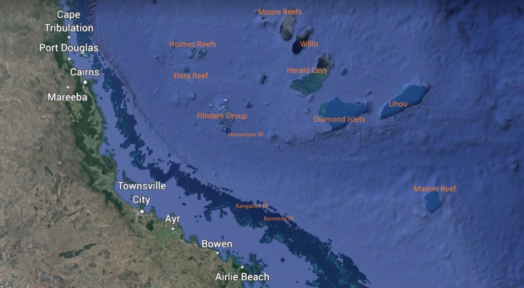 We had initially thought we would leave from Airlie Beach to go to Windy Bay at the top of Haselwood Island and then do the big overnight sail to the Lihou Atoll, but the updated forecasts showed the wind would be too easterly. We did not fancy a rough run into wind, nor did we want to motor there. So we made another plan. We would head to the Outer Reefs first, visit a couple of new ones for us, then track north to another Coral Sea atoll: to the Flinders Group.