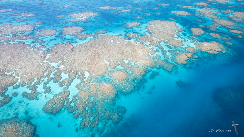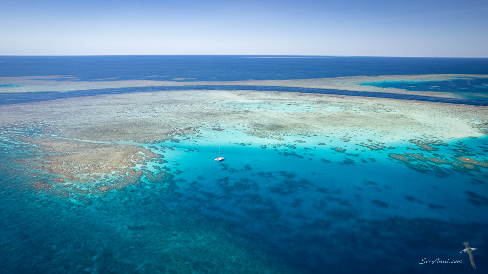 As you can see from the aerials, the edge of the reef is like a mosaic of bommies, quite spectacular. Although there is a lagoon, it is peppered with “black speckles” and entry passages are far too narrow to get in with Anui, but accessible by runabouts or dinghies.