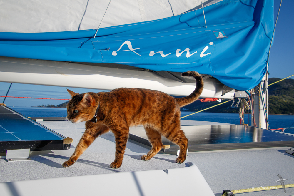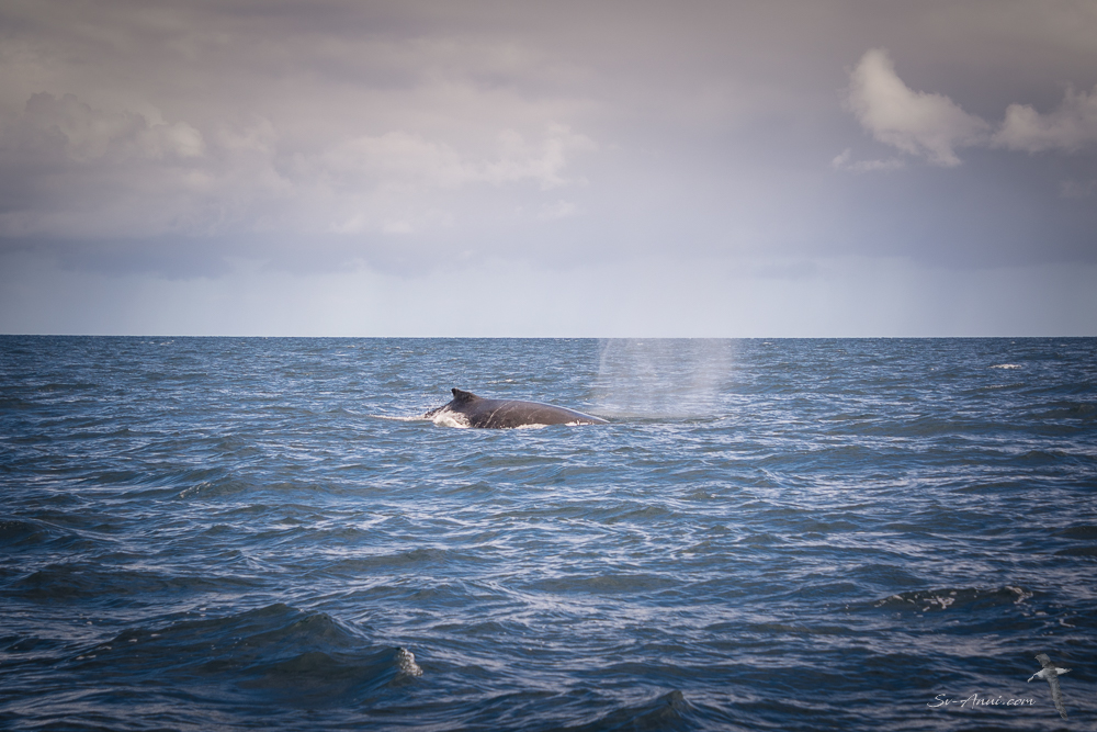 We had visions of this 30 tons behemoth surfacing for a breath under our bridge deck and lifting Anui out of the water – a good incentive to trim those sails.  We were both getting nervous… “surely it knows we are there and will avoid us?” Just to be on the safe side we turned an engine on so it would be sure to hear us, and to be ready to put the speed on if needed. But the next time it surfaced it was to our port side… and then it took a dive straight down, fluke up…. phew!