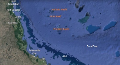 We have included another Google chart showing the coast, Great Barrier Reef and a few of the atolls in the Coral Sea. You can also see the grey line on the outside of the GBR which shows the edge of the Continental Shelf.