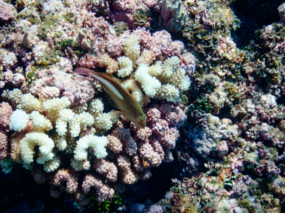The one interesting find: a whitelined Coralgoby, just resting on a rare patch of colourful coral, with its pectoral fins holding him in place like hands, unafraid of the photographer.