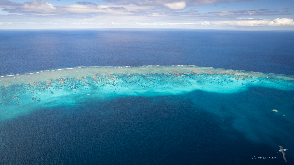 It was impossible to get an aerial shot that showed the rim of the atoll we were in as Horseshoe Reef is so vast. But here are a few images which will give you an idea of what it looks like. The aqua strip is 5 to 10m deep, the dark blue 30-50m.