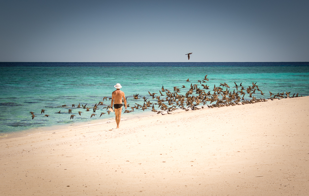 Main Cay is only 12 nm away, with a passage at the bottom of the atoll between it and Southwest Reef to get inside. The Main Cay Reef is triangle shaped. We anchored in front of the cay in a depth of 5m over a huge expanse of sand. What a spectacular place! We could not resist going ashore. There is a weather station on the cay, a thin strip of sand devoid of any vegetation, but with lots of birds vying for room to rest. Masked Boobies, Brown Boobies and Noddies congregated in small groups.