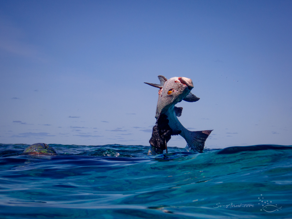 We snorkeled at a few of the bommies to the left of Anui in the second aerial, but it was not very good. Lots of fish, very clear water, however the coral was poor. The central bommies of the previous day were far better. But there were lots of fish, some rather large and they seemed quite calm around us, which for one of them was a fatal mistake. Wade caught us a Sweetlip! Having spotted a big shark, a Grey Whaler cruising nearby, he swam back hurriedly to the dinghy with the catch out of the water – we call it “fish on a stick”.